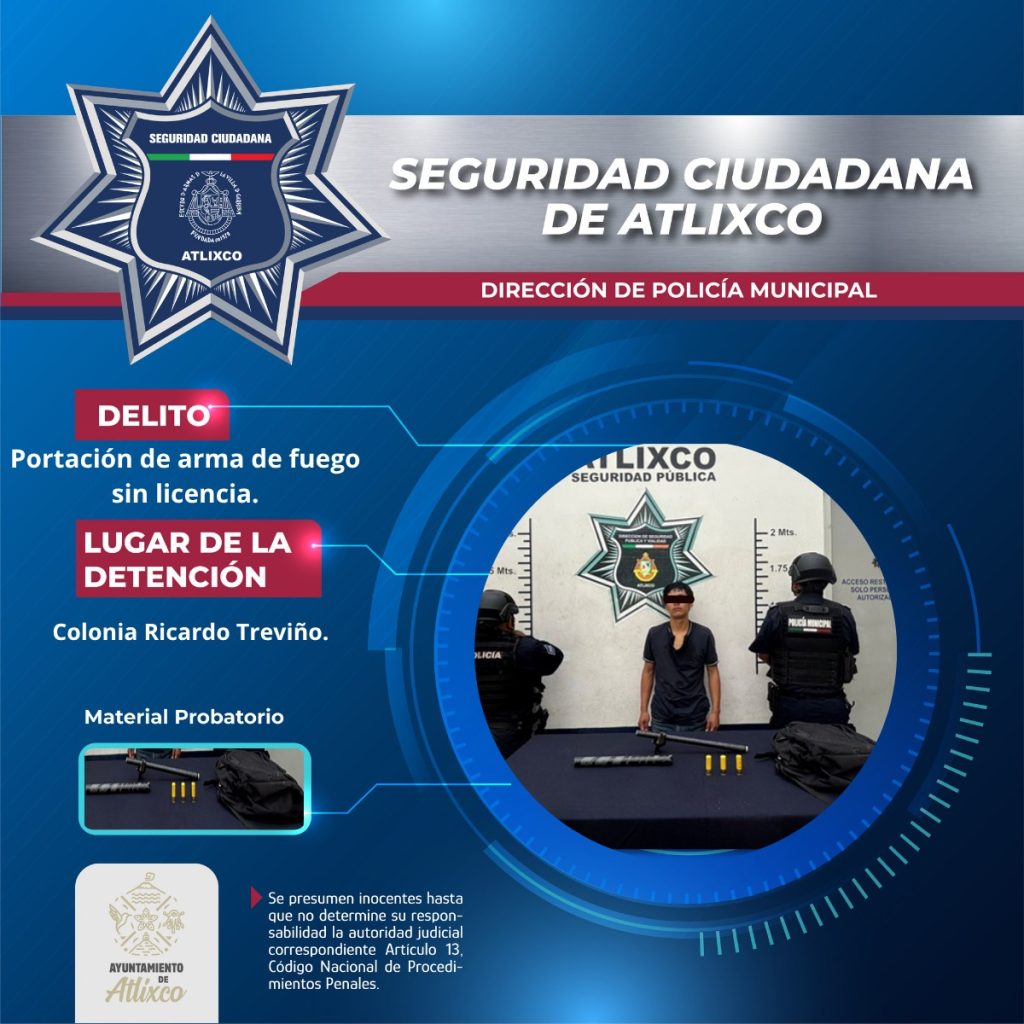 ATLIXCO, Pue. — Como parte de las estrategias de vigilancia y prevención del delito, elementos de la Secretaría de Seguridad Ciudadana de Atlixco lograron la detención de un sujeto en posesión de un arma de fuego de fabricación casera. El artefacto, que representaba un riesgo latente para la población, fue asegurado junto con cartuchos útiles.